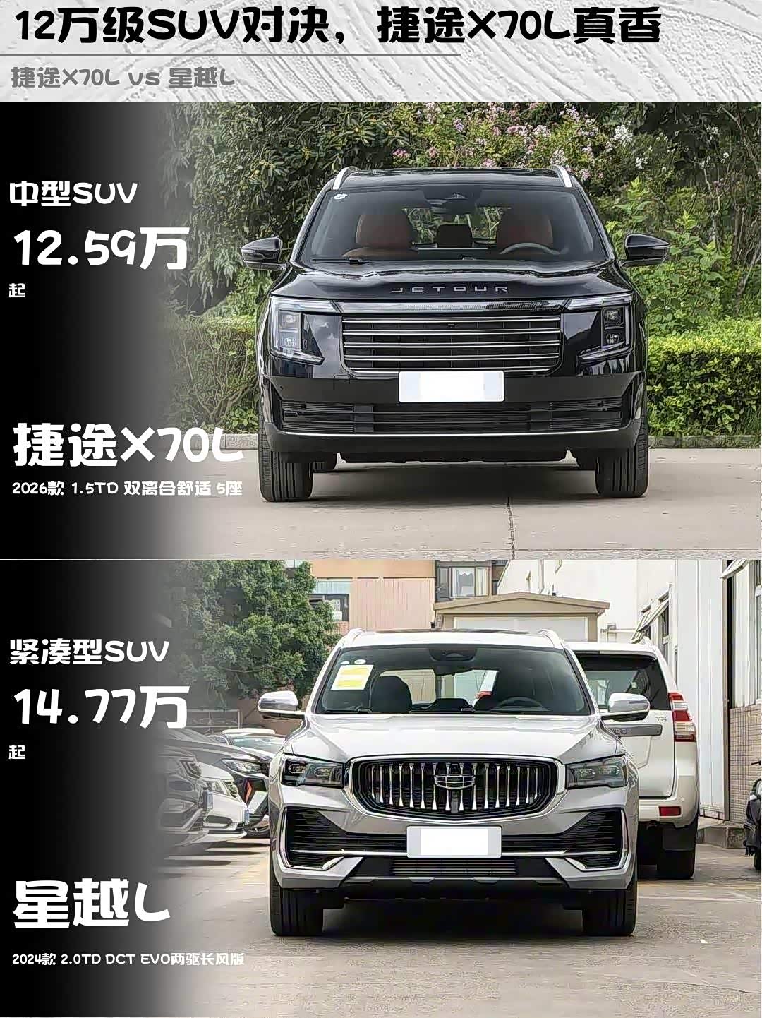 车家号·0浏览·2026-01-22 08:49 · 北京最近后台好多兄弟问12-15万预算买SUV怎么选,今天直接拉出两台热门选手—— 捷途X70L(参数|询价) 2026款1.5TD双离合舒适版(12.59万)和星越L 2024款2.0TD两驱长风版(14.77万)来场硬核PK!🔥