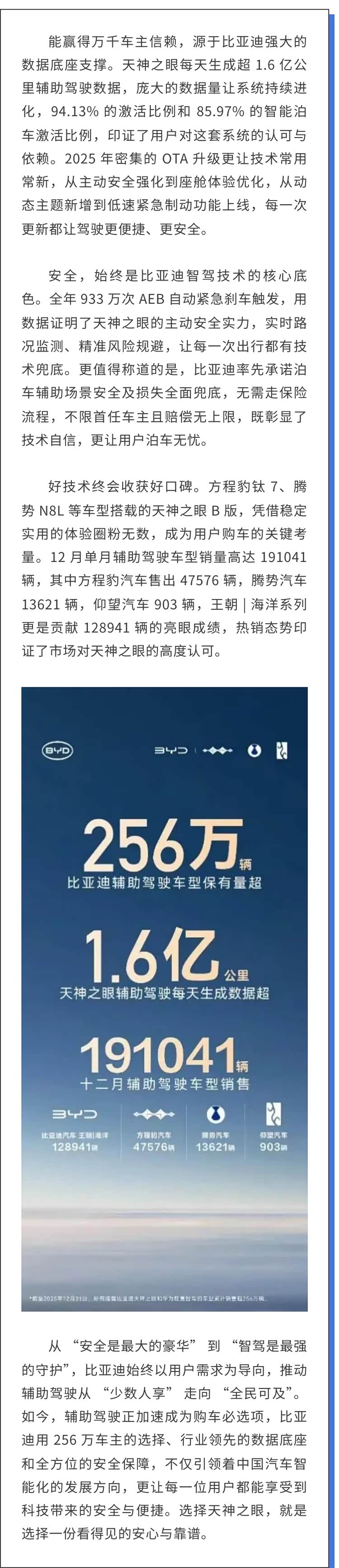 车家号·0浏览·2026-01-22 09:56 · 山西当辅助驾驶从汽车行业的 “加分项” 变成用户购车的 “必选项”,比亚迪用实力给出了最优解。截至 2025 年 12 月,比亚迪辅助驾驶车型累计保有量超 256 万辆,稳居中国车企第一,让 “全民智驾” 的承诺照进现实,让技术普惠走入千家万户。