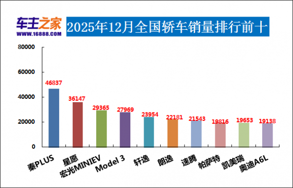 2025年12月轿车销量排行前十(单位:辆)