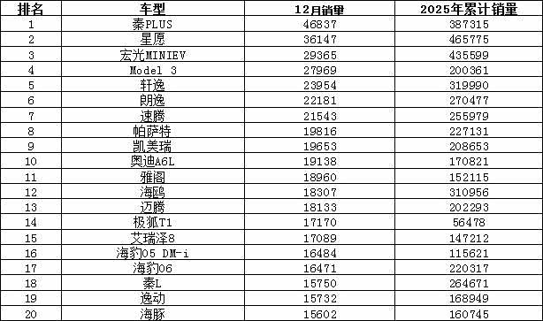 2025年12月汽车销量排行榜 钛7涨势迅猛