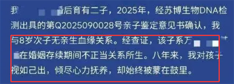 但谁能想到,在2025一个偶然的念头让他决定去做一次亲子鉴定。当他怀着忐忑的心情拿到苏博生物出具的DNA检测报告时,他的世界瞬间崩塌。因为报告上明确显示,他与八岁的小儿子之间没有任何亲生血缘关系。