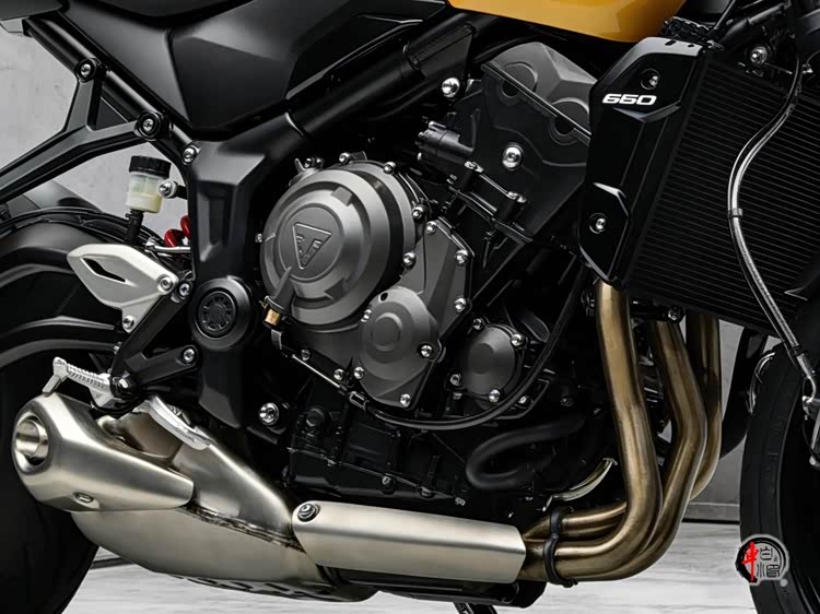 动力核心全面升级,凯旋此次对三叉戟 660的升级,从核心引擎率先发力。这款 660cc的直列三缸引擎完成深度改造,最大功率从 81匹马力提升至 95 马力,最大扭矩稳定在 68Nm。其中最关键的升级集中在供油系统:原车的单节气门体被替换为三缸独立节气门布局,进气效率大幅提升。空气箱也进行了加大设计,进一步优化进气流量。气缸盖为全新重制版,排气门口径加宽,凸轮轴轮廓也重新调校。发动机转速限制器提升至 12650rpm,较老款提高 20%,拉高转速换挡时,动力输出会更迅猛。