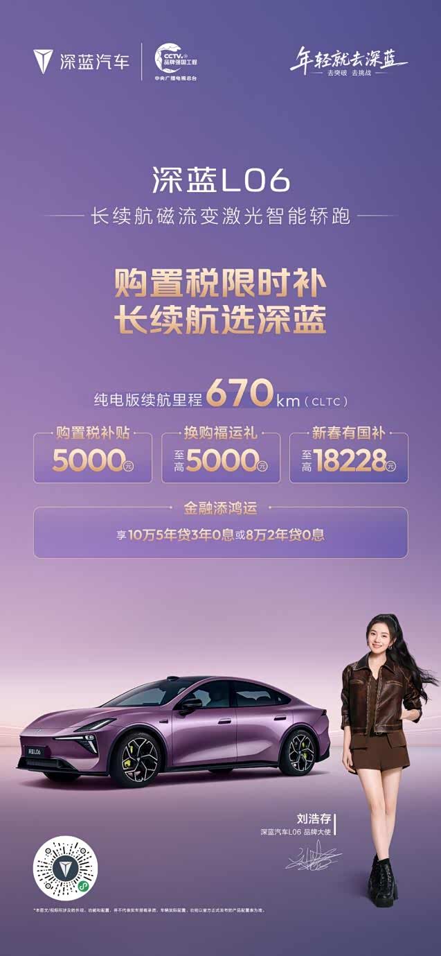 同时,深蓝L06以满满诚意推出多重购车福利,大幅降低智能座驾拥有门槛。消费者购车即享5000元购置税补贴、至高5000元换购福运礼、至高18228元新春国补,金融方案可享10万5年贷3年0息或8万2年贷0息。年轻消费者无需背负高额资金压力,就能轻松入手这款颜值与续航兼备的智能轿跑。