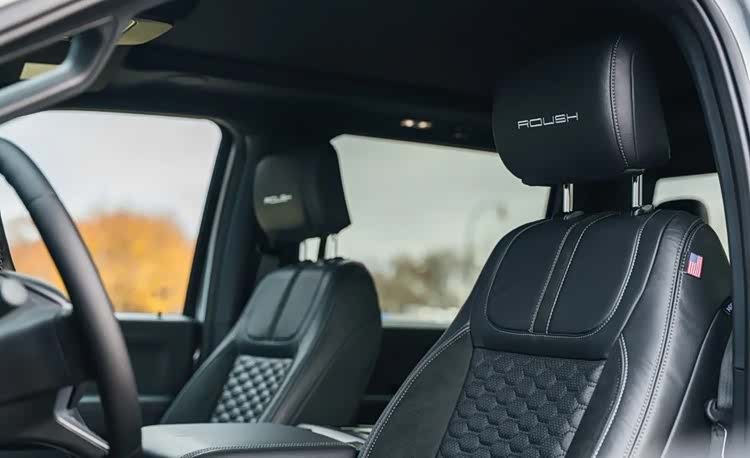 如果选择了高级版套件,内饰质感将进一步提升。它会引入碳纤维内饰板,并提供咖啡棕与黑色拼接或纯黑色两种Roush高级皮革内饰选择,头枕上还会有精美的刺绣,让工具皮卡也能拥有接近豪华车的座舱氛围。