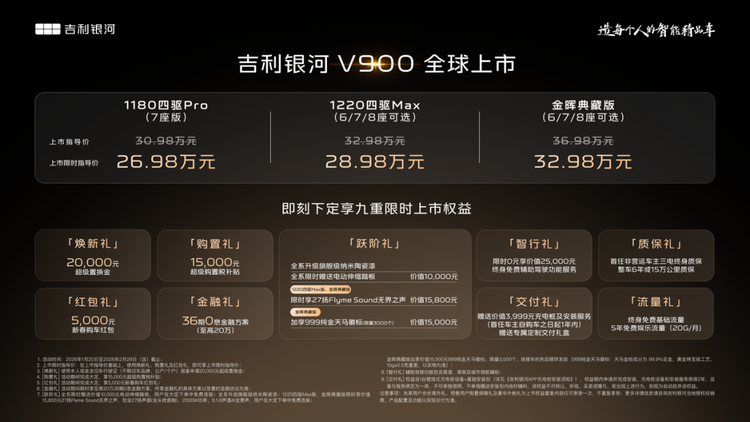 豪华MPV再添一款重磅车型,吉利银河V900用极富诚意的价格,搅动MPV市场格局,即日起至2026年2月28日,购车用户可享受换新礼、购置礼和红包礼,叠加各种福利后,价格直接低至26.98万元起,全系车型的正式售价整整比预售价低了6万元。