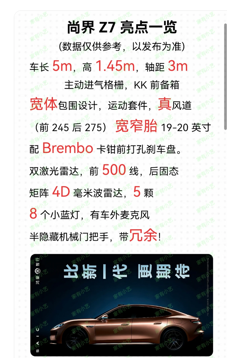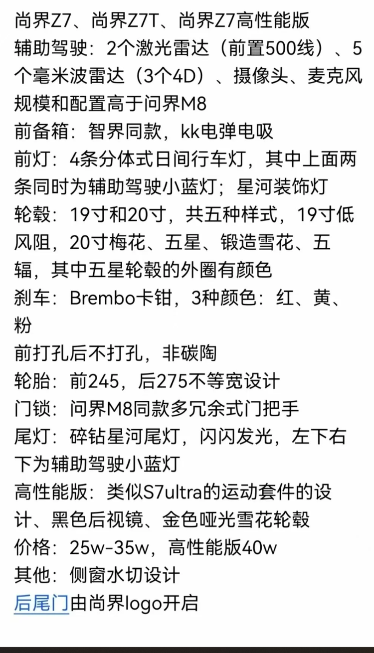 不过需要注意的是,目前曝光的所有配置均为网传信息,仅供参考,具体参数还需以官方发布为准。但仅从现有信息来看,尚界 Z7 已经具备了成为 “爆款” 的潜力 —— 华为的技术加持保证了核心竞争力,满配的硬件配置满足了消费者对性能和智能的需求,高颜值设计则抓住了年轻群体的审美。