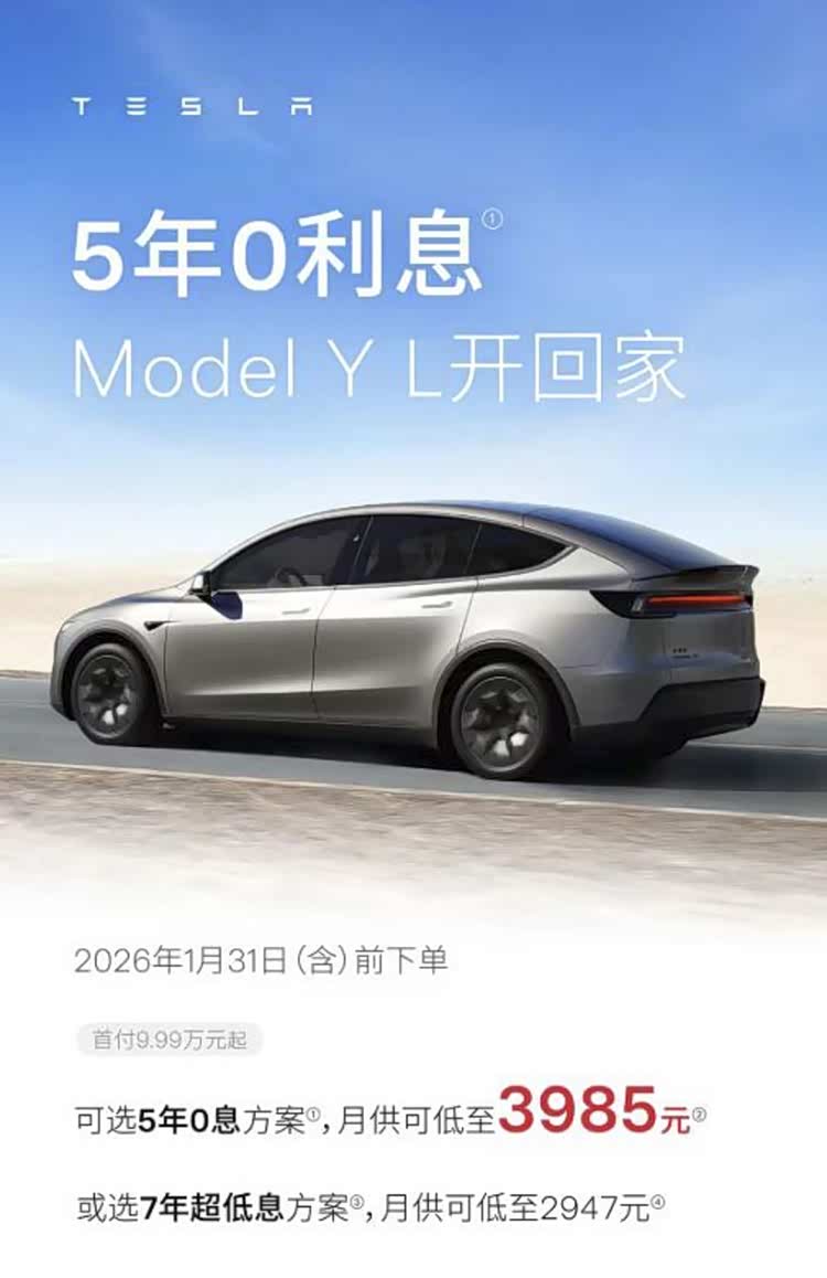2026年率先推出较大优惠政策的当属特斯拉,它针对六座版的Model Y L推出了“五年0息”方案;同时又针对Model 3与Model Y的后轮驱动版、长续航后轮驱动版、长续航全轮驱动版,以及六座版的 Model Y L(参数|询价),首次推出了“七年超低息”方案。