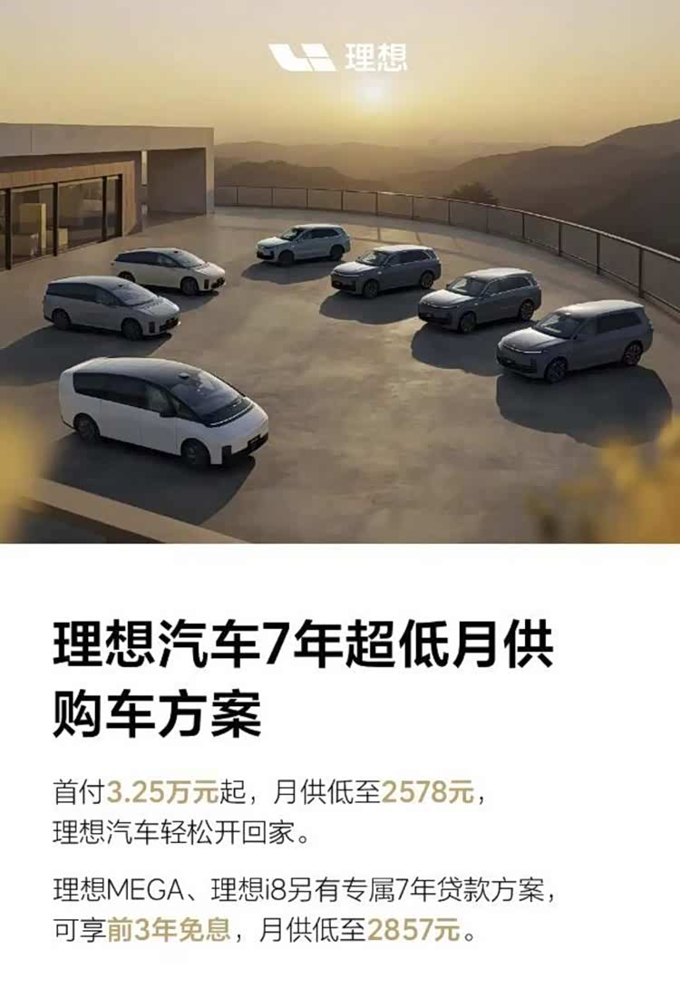 理想汽车也推出了相应的优惠政策,推出7年超低月供购车方案,首付3.25万元起,月供2578元。同时针对理想MEGA、理想i8另有专属7年贷款方案,可享前3年免息,月供2857元。