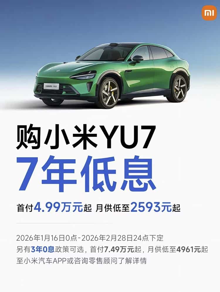 就在特斯拉刚刚推出优惠政策后不久,小米汽车也紧随其后,针对小米YU7也推出了“七年超低息”方案,购买YU7可享最低4.99万元首付,月供低至2593元起;同时还有3年0息政策可享,首付7.49万起,月供4961元起,并且限时全系赠送双零重力座椅。