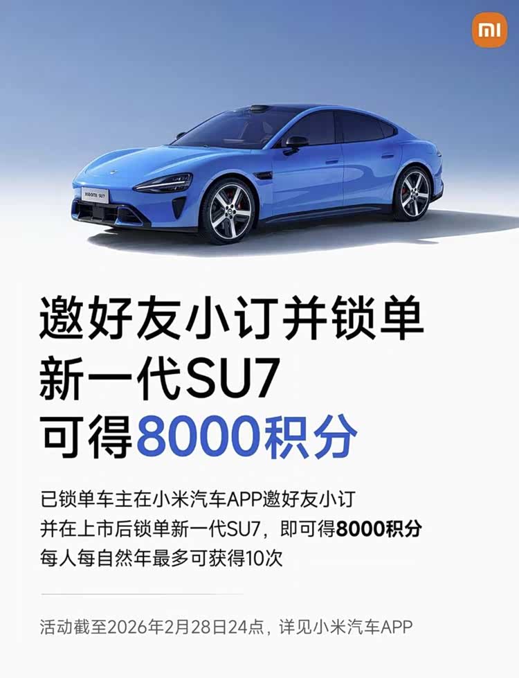 另外,针对小米SU7,已锁单车主邀好友小订并在上市后锁单新一代小米SU7,即可得8000积分。