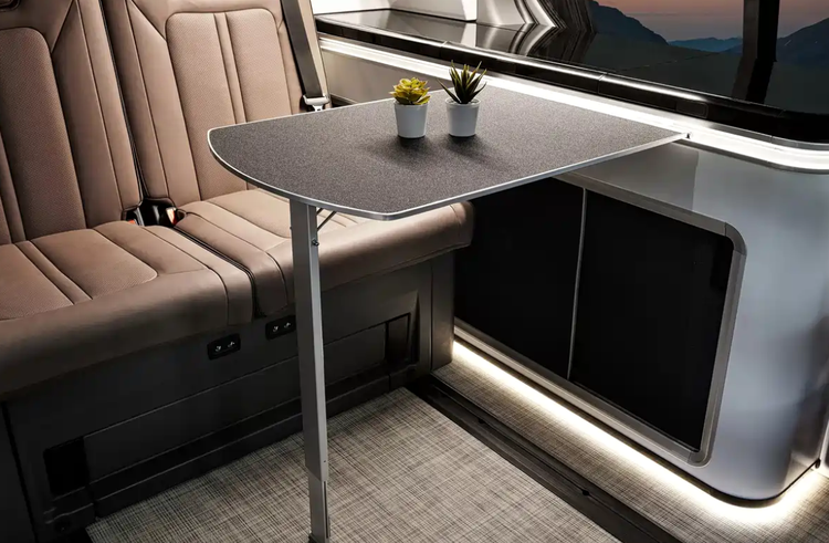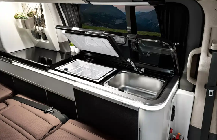 车内的功能更加丰富,除了灵活的座椅组合,还配备了洗手盆、冰箱、可移动小桌板、厨房台面、控制屏幕,功能的齐全程度,甚至可以媲美一些独立的单体房车。动力部分,新车采用纯电形式,拥有800V高压平台,10%-80%充电不到20分钟,搭载84kWh的电池包,WLTP续航里程400km,电机最大功率160KW。