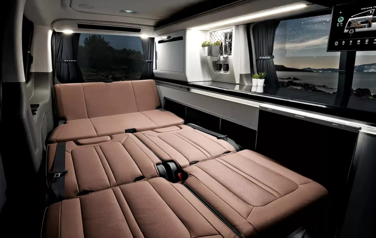 现代Staria Camper Concept看起来的主要亮点是,车顶配备了电动弹出和可伸缩设计,进一步扩充了车顶空间,开启后,车内可以形成一张大床,还有一块520瓦的太阳能电池板,每天可产生2.6kWh电,可以为车内设备供电或增加续航。