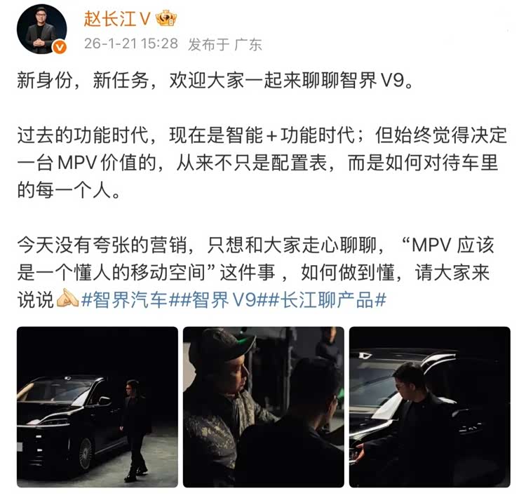 之所以赵长江的此次履新引发业内热议,不仅仅是因为他是一位在比亚迪任职长达16年的王牌人物,更是因为在官宣入职智界前,他还曾转发了 智界V9(参数|询价)的预热视频,并直言智界V9“保守估计三年内没有对手”。这种高调表态,一方面体现了个人信心,另一方面也传递出智界在高端智能赛道主动抢占话语权的强烈意图。