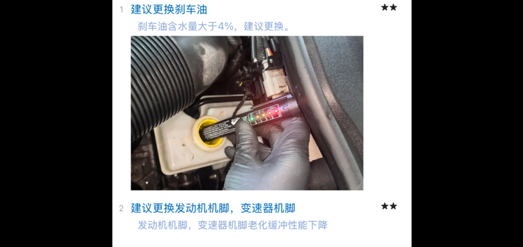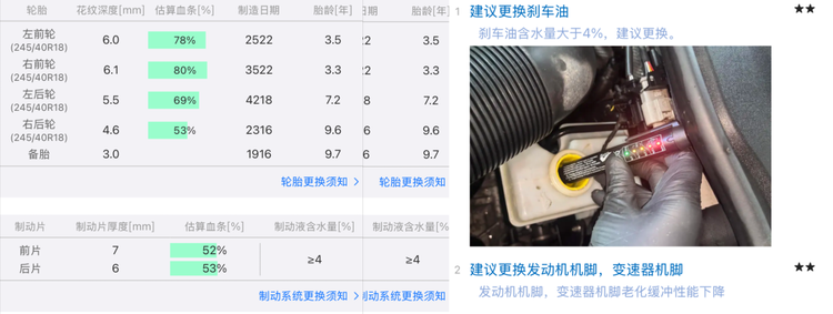 你看像减振刹车冷却液这种4S很关心的,都维持在很好的状态。而像轮胎这种费钱的,或者刹车油这种细枝末节的,状态就不太好。