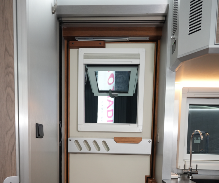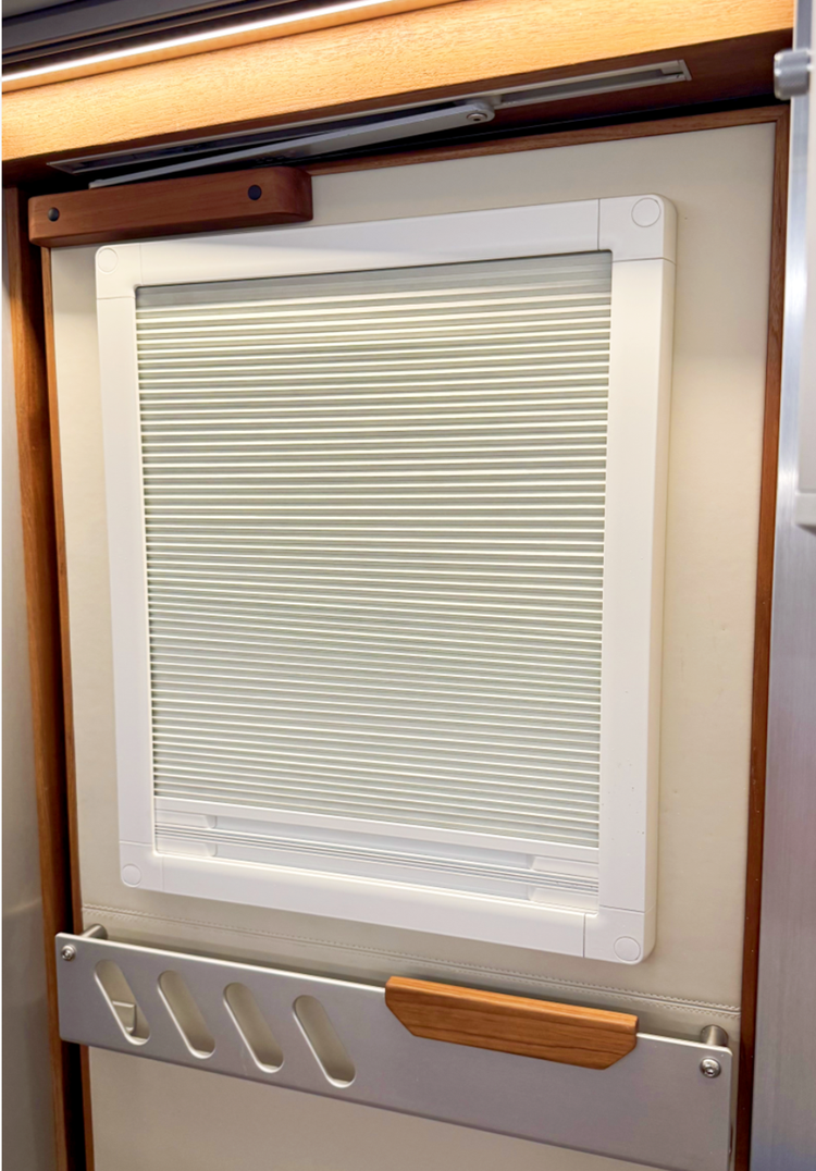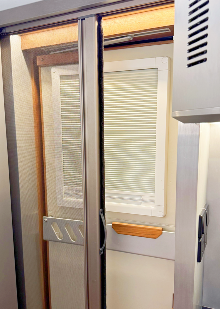 门板上又有一处亮点设计,是诺马迪森专属的可开启玄窗,设计得既实用又精巧。不同于普通房车的固定车窗,这扇玄窗自带防虫网和遮阳帘,轻轻一拨就能开启。试想在郊外营地,清晨推开玄窗,不用打开主门就能让山间的清风漫进车内,阳光透过薄帘洒下柔和的光斑,既保证了车内的通风与采光,又能牢牢挡住野外恼人的蚊虫和正午刺眼的强光,把自然与舒适都留在舱内,这份细腻的考量,让越野旅居多了份从容。