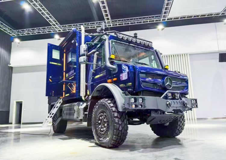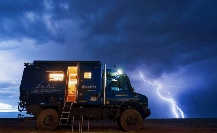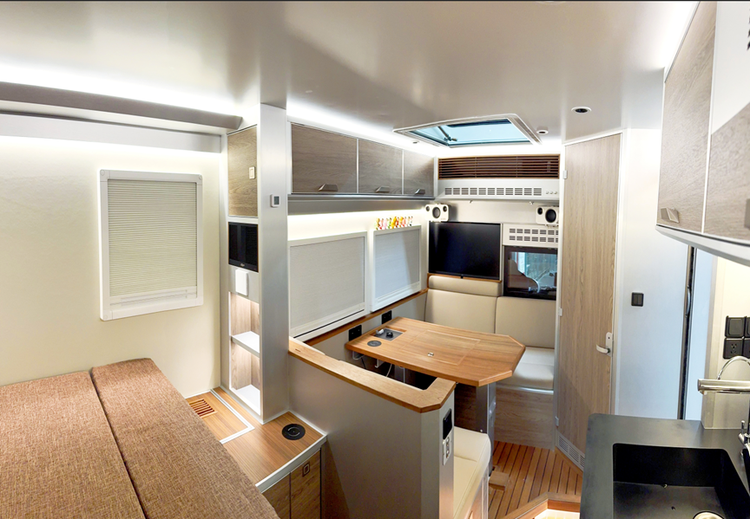 推开生活舱那扇厚重而充满安全感的大门,仿佛踏入了另一个世界。在这里,越野的征途化为了一个温馨舒适的休憩港湾,每一处细节都凝聚着设计师的匠心独运,处处流淌着对居住者的深深关怀。一踏入,迎面而来的是一股宁静与舒缓的气息。不同于驾驶舱的科技感和硬朗风,生活舱采用了较为柔和、温暖的材质和色彩搭配。或许是天然木纹的温暖触感,搭配低饱和度的织物,又或是细腻的仿皮革触感,都在瞬间瓦解了旅途的疲惫。头顶的LED灯光柔和地投射下来,营造出一种私密而宁静的居家氛围,让你瞬间卸下防备,全身心地投入到放松之中。