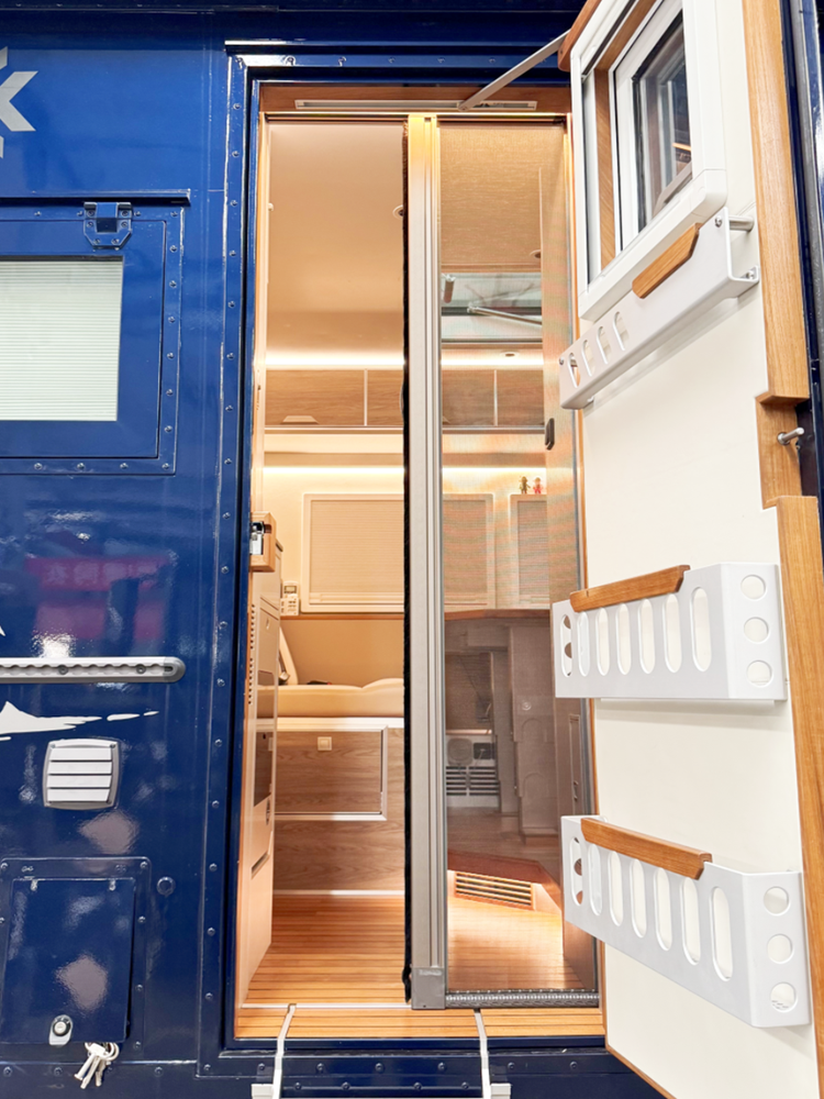 欣赏了硬朗帅气的外观,感受了硬核的越野实力,体验了简约和臻美的驾驶室,现在可以放松一下,一起来感受房车生活的精髓之地。走近“ 撼路者(参数|询价)Q”的生活舱,目光首先被那扇主门牢牢锁住。它没有传统房车车门的笨重感,却自带一种低调又臻美的质感,光是初见,就藏着让人惊喜的细节。伸手轻触门板,指尖能感受到细腻却扎实的触感。这扇门是德国朗士碳纤维玻纤混合编织复合板材与PMI板的精妙结合,既兼顾了硬核的坚固耐用性,又很大程度减轻了门板重量,开关门时完全没有拖沓的沉坠感,力道掌控恰到好处。