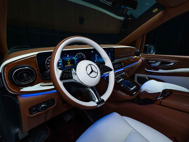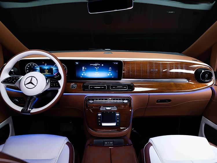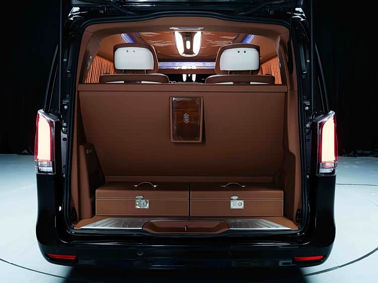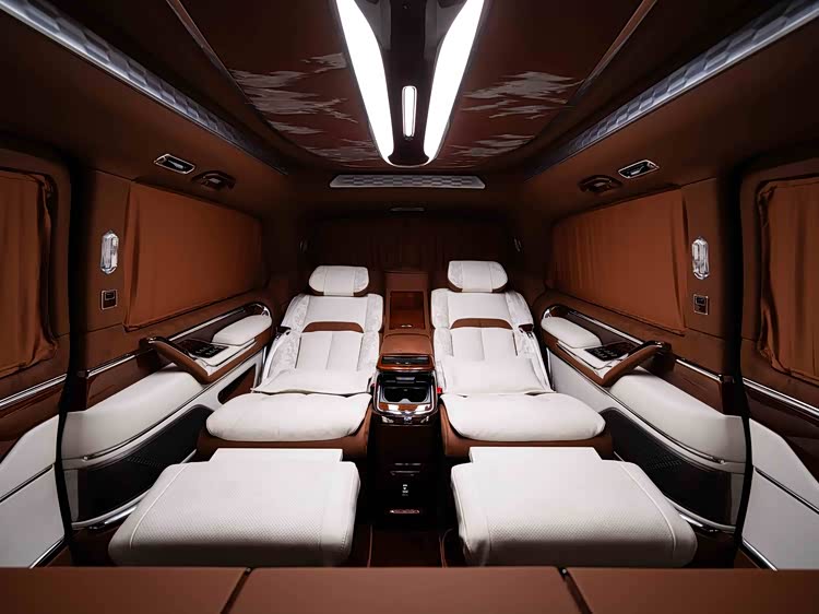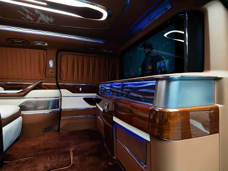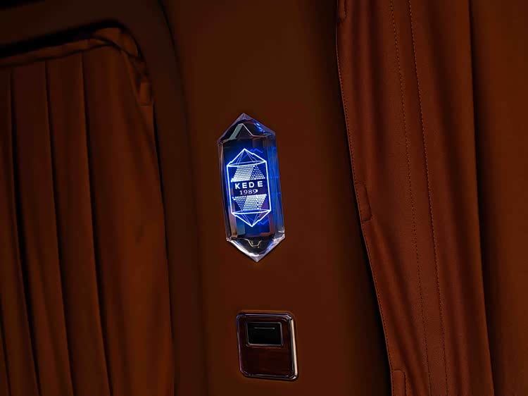 车内使用加拿大雀眼枫木手工包覆,并搭载羊绒地毯、水晶顶灯及64色氛围灯。