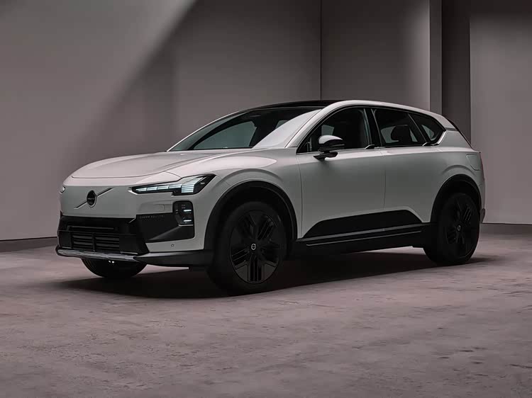 我们首先来看新车的外观设计方面,EX60的前脸设计延续了沃尔沃家族化风格,但细节处更具创新性。封闭式格栅符合纯电车型主流趋势,中央悬浮式车标与两侧分体式大灯组形成视觉焦点。上方“雷神之锤”日行灯采用LED点阵光源,辨识度极高;下方远近光灯组嵌入黑色装饰区域,搭配梯形下格栅和雾灯区黑色包裹,营造出层次分明的立体感。前保险杠的主动进气功能可优化风阻,进一步提升续航表现。整体设计既保留了沃尔沃的经典元素,又通过低风阻造型强化了电动车的科技属性。