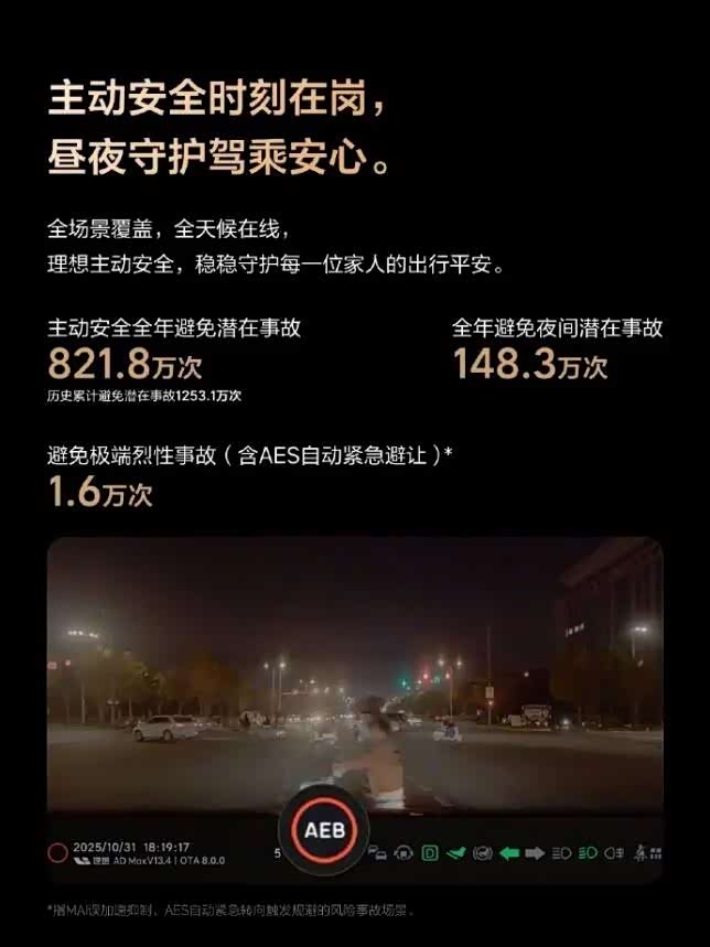 种种提前预知的努力究竟有多大意义?数据或许回答了一切:2025年,理想汽车的主动安全系统帮大家规避了821.8万起潜在事故,其中夜间潜在事故避免148.3万次,极端烈性事故(含AES自动紧急避让)避免1.6万次。