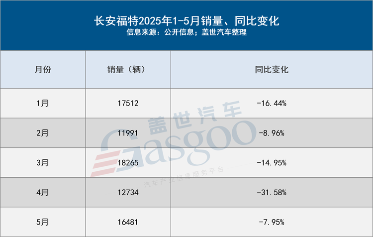 根据重庆长安股份有限公司发布的产销快报,长安福特在2025年前五个月销量连续同比下滑:1月销量为17512辆,同比下滑16.44%;2月11991辆,下滑8.96%;3月18265辆,下滑14.95%;4月12734辆,下滑31.58%;5月16481辆,下滑7.95%。