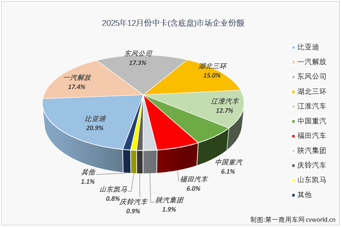 上表可见,2025年12月份中卡销量前十企业6增4降,其中比亚迪、东风、三环和陕汽等企业,同比分别增长了493%、103%、1601%和71%,增速高于市场整体增速,跑赢12月份中卡市场“大盘”;江淮和凯马同比分别增长2%和14%,实现增长但跑输市场“大盘”;与此同时,同比出现下滑的几家企业降幅均达到两位数,下滑最严重的企业12月份销量同比下降了81%。