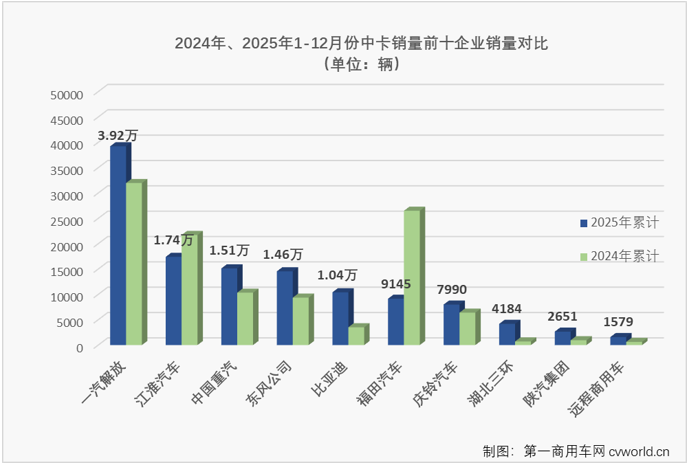 2025年全年,中卡市场累计销售12.51万辆,同比下降2%,累计销量降幅较11月过后(-5%)缩窄3个百分点。具体到销量前十企业来看,大多数企业在2025年实现增长(销量前十8增2降,如下图)。