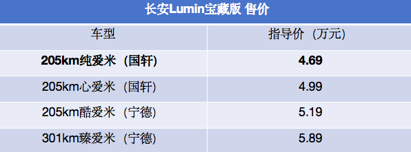 日前我们获悉, 长安Lumin(参数|询价)宝藏版新增上市205km纯爱米版,官方指导价4.69万元。该车属于长安Lumin宝藏版的全新入门车型,通过取消部分功能配置,令长安Lumin宝藏版车系的购买门槛进一步下探。