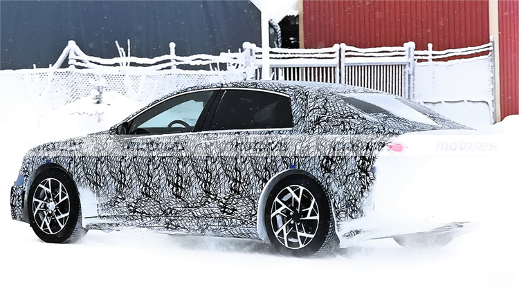 视线转到侧面,它没有盲目追求极致风阻而把自己变成“邪恶大鼠标”,而是保留了传统三厢轿车那份圆润、优雅的线条。腰线采用了分段式设计,光影流转间层次感分明。谍照中那套五辐式轮毂造型相当夸张,甚至带着一丝改装车的野性,如果不只是测试件而是量产标配,那这台车的运动属性绝对值得期待。