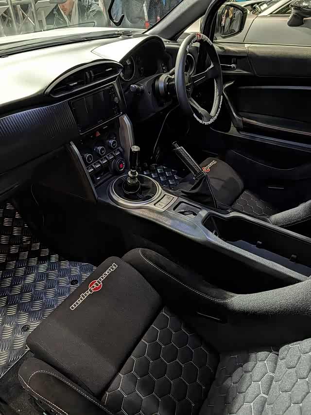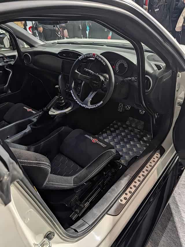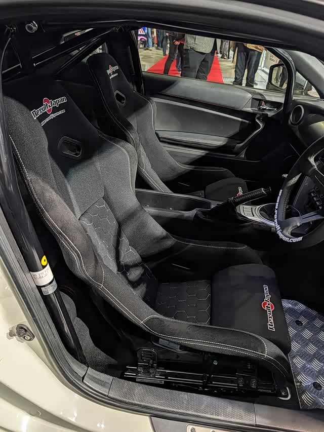 这辆NEO86的内饰正如它的外观一样充满竞技气息,跨过撑满驾驶舱的防滚架之后,所见之处换上了Result的竞技方向盘、加长挡把,还有质感很好的翻皮赛车座椅,另外地毯也换成了防滑的铝合金板。