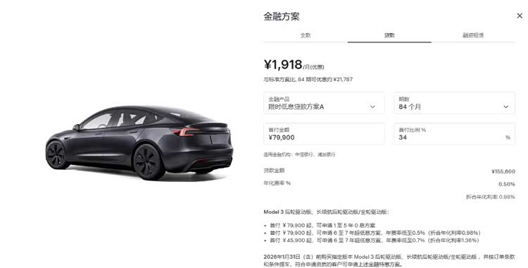 最便宜的Model 3后轮驱动版,指导价23.55万元,在不选装的情况下,首付金额7.99万元,贷款金额15.56万元,分84期,月供1918元,年化费率0.5%,折合年化率0.98%。算下来每年的利息在800元左右,7年总利息是5000多元。听起来是不是还不错?0.98%的年化率远低于市面上所有的车贷,而且比活期利率还要低,说白了就是把钱随便存个低风险的理财,哪怕是余额宝、零钱通,按当下的情况来看都是可以跑赢利息的。