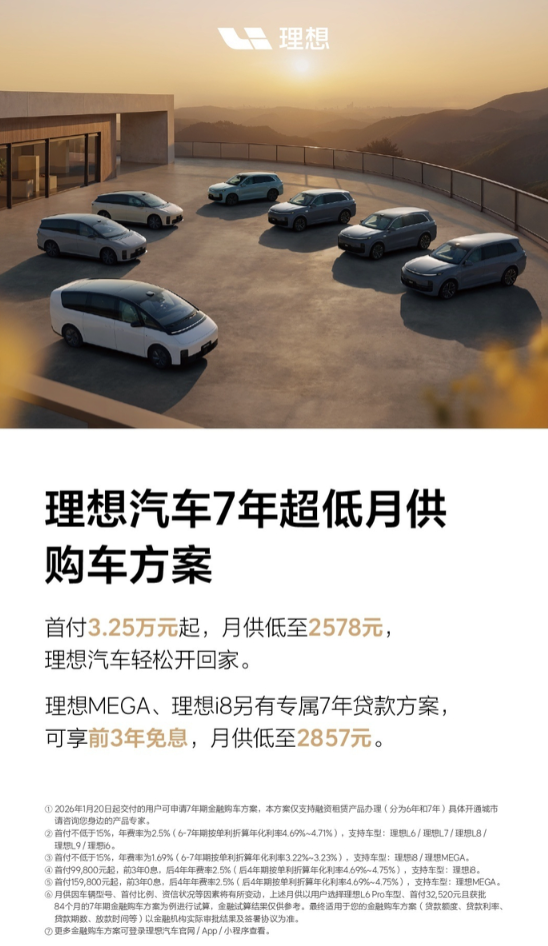 1月20日,理想汽车官宣全系车型均可享受7年超低月供购车方案,首付3.25万元起,月供2578元起,年费率2.5%。MEGA与i8,还有专属的7年贷款方案,前三年可享受免息优惠,月供低至2857元,年费率为1.69%,折算后年化利率约3.22%,比起特斯拉,理想这边利率要高一些。