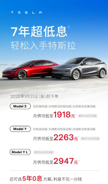 1月6日,特斯拉打响了一波促销反攻,对六座版的 Model Y L(参数|询价),推出了“5年免息”方案;针对Model 3与Model Y的后轮驱动版、长续航后轮驱动版、长续航全轮驱动版,以及六座版的Model Y L,首次推出了“7年超低息”方案。