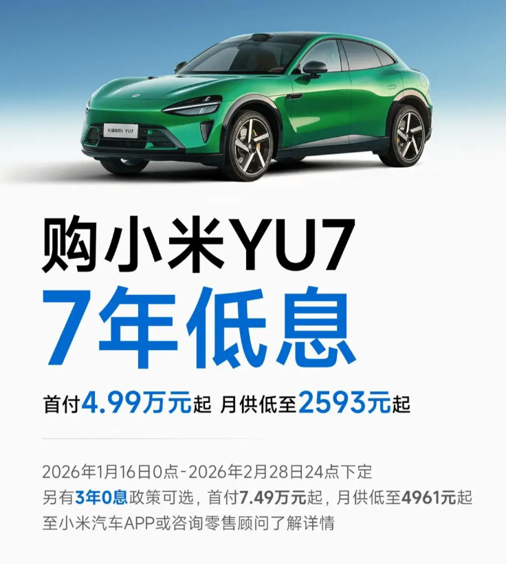 再来看小米这边,1月15日小米汽车也跟进了7年低息的政策,YU7的首付来到了4.99万元起,月供为2593元起,年化利率约在1.03%。毫无疑问,这一波政策的跟进,就是为了大家“站在同一条起跑线上”。花5万开走一台YU7,对于一些年轻人来说工作个一年可能就买得起了。
