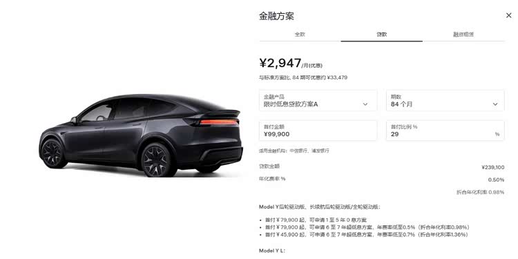 Model Y L这边,首付9.99万元,月供2947元,年化利率约0.98%。利率是一样的,区别在于月供,还是那句话,要是以“租车”的视角来看待,那这个月供真心不贵,大家可以打开租车软件看下月租价格,这个价位的车型租金还是很贵的,而7年低息更像是一种以租代购的形式。