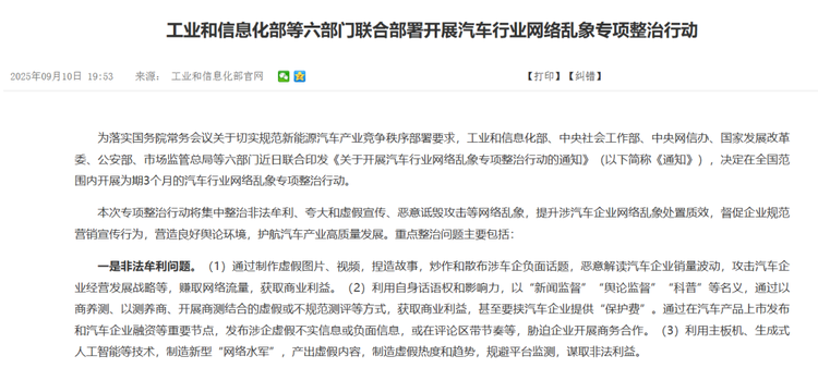 事实:为落实国务院常务会议关于切实规范新能源汽车产业竞争秩序部署要求,工业和信息化部、中央社会工作部、中央网信办、国家发展改革委、公安部、市场监管总局等六部门9月联合印发《关于开展汽车行业网络乱象专项整治行动的通知》(以下简称《通知》),决定在全国范围内开展为期3个月的汽车行业网络乱象专项整治行动。