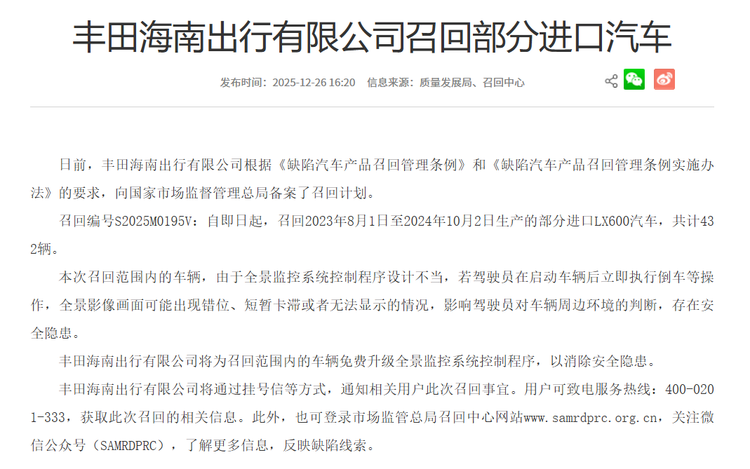 事实:2025年,国家市场监督管理总局共发布汽车相关召回公告114个(包含工程车辆及轮胎召回),与2024年相比减少27个。其中,共涉及54家车企的300余款车型,召回总量在经历2024年冲高后开始回落,共召回汽车6,845,713辆,同比下降39.1%。
