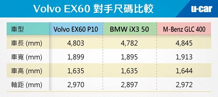 沃尔沃EX60 推出后,于新车市场上所面对最直接的对手,即为 BMW iX3 以及 Mercedes-Benz GLC 400 4Matic 纯电车系,而就车身尺码设定上看来,其中 Mercedes-Benz GLC 400 4Matic 车系拥有最长的轴距、车长、车高以及车宽设定,沃尔沃EX60 与 BMW iX3 车高相同,但可明显看出沃尔沃EX60 拥有较长的轴距设定,车长及车高也较 BMW iX3 有所增加。