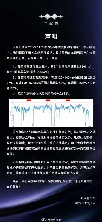 2023 年 12 月,方程豹豹 5 上市之际,姚*强通过抖音账号“大秦军陕团”发布视频,声称以正常驾驶方式测试方程豹旗下车型 豹5(参数|询价),得出百公里油耗18升的结论,在网络上引起了大范围的关注及讨论。之后应警方调查取证需要,比亚迪调取数据显示:测试当日车辆存在大量异常驾驶行为,高速行驶过程中有3个时段车速超过180km/h, 有6个时段车速超过170km/h,在整段高速行驶过程中,车速120-140km/h区间占比超过37%,车速140-160km/h区间占比超过46%,车速超160km/h占比超过4%。