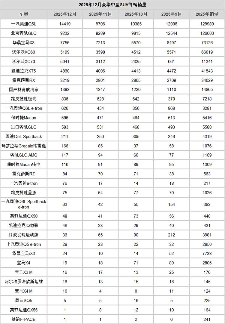 豪华中型SUV市场是一个市场份额较大且竞争激烈的细分市场,为了获得更大市场份额,不少车型都开启降价冲量模式,即便是 奥迪Q5L(参数|询价)这种市场认可度较高的车型,也不得不选择以价换量。不久前上市的全新一代奥迪Q5L,其官方价格已经低至30.98万元,相比老款车型官方降价4万元且还在配置方面有提升。全新一代Q5L的降价上市,也预示着2026年的国内豪华中型SUV市场竞争会更激烈。