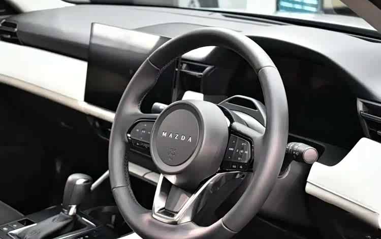 坐进驾驶舱,感觉和外观一样老派,但用着顺手,中控屏是块十五点六英寸的大屏,挡把还是传统的机械杆,摸着心里踏实,座椅和中控台用两种颜色拼在一起,看着像家里那张布艺沙发,方向盘上的银色装饰不花哨,MAZDA几个字在阳光下闪一下,就让人想起老车迷常说的那些经典模样。