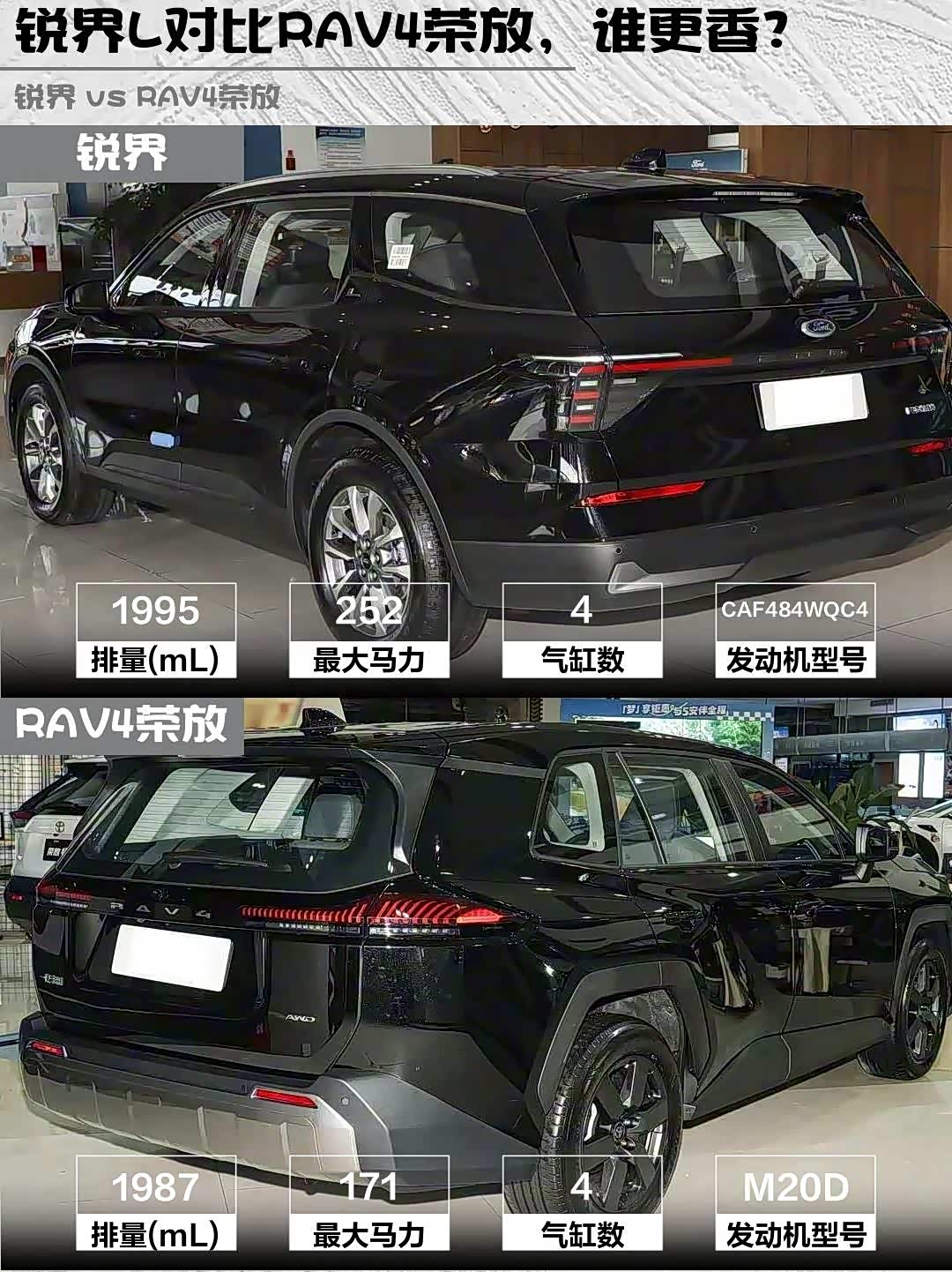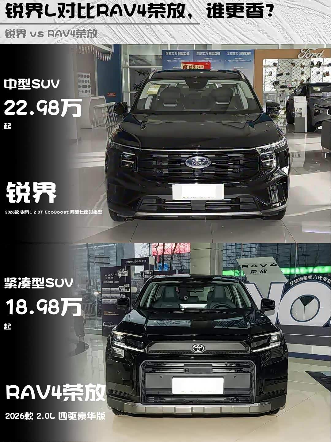 最近后台好多朋友在问:预算20万左右,想买台靠谱SUV,2026款锐界L 2.0T两驱七座时尚型和2026款 RAV4荣放(参数|询价)2.0L四驱豪华版到底怎么选?作为深度体验过两台车的"老司机",今天掏心窝子聊聊真实感受!🔥