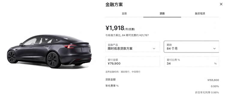 小刘仔细算了一笔账,以Model 3后轮驱动版为例,官网售价23.55万元,选择7年超低息方案后,首付7.99万元,贷款约15.56万元,分84期还款,月供1918元,年化费率0.5%,折合年化利率约0.98%。照此计算,7年总利息仅5000多元,平均每年利息成本不到800块。