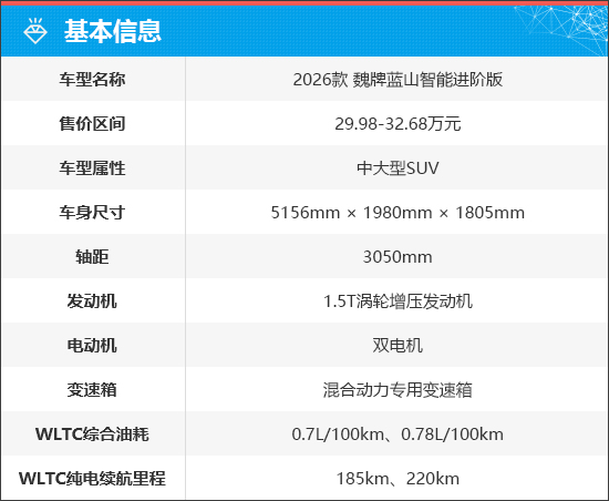 2026款魏牌蓝山智能进阶版共推出3款配置车型,售价区间为29.98-32.68万元,限时焕新价27.58-30.28万元。与此同时,官方还推出了保险补贴礼、购车无忧礼、升级无忧礼等上市权益(详情请咨询当地经销商)。