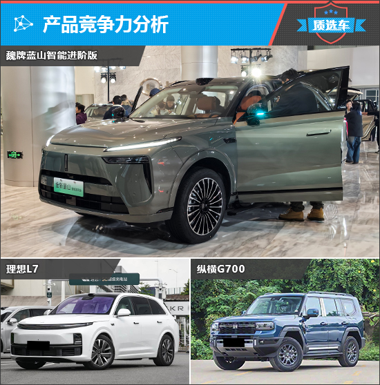 魏牌蓝山智能进阶版定位为中大型SUV,搭载插电式混合动力系统。参考车型定位以及价格区间,最终为其挑选的竞品车型分别是理想L7和纵横G700。