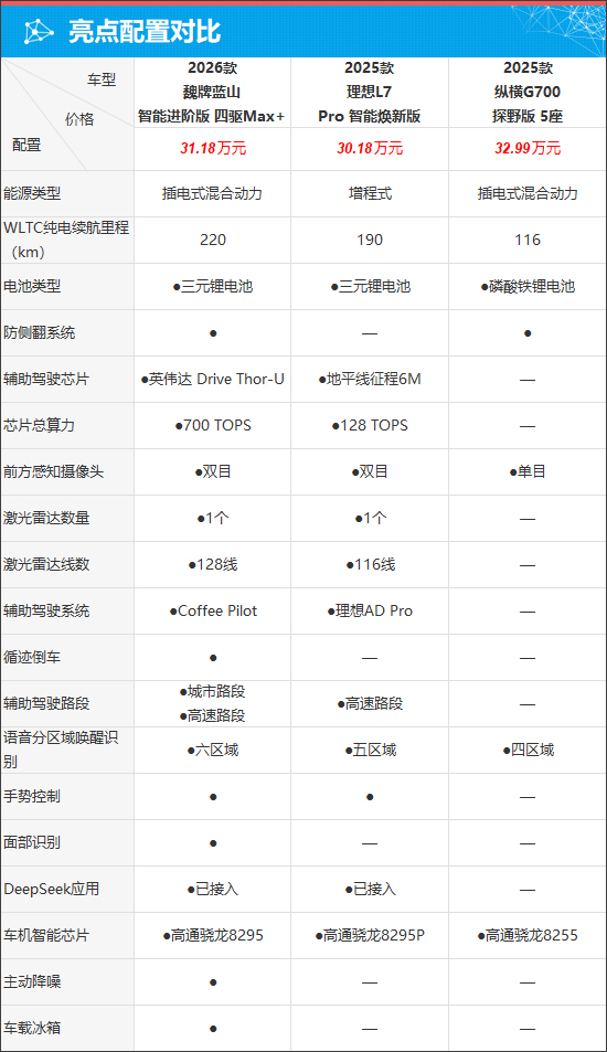 具体到车辆配置层面,我们挑选了售价尽可能相近的车型。魏牌蓝山智能进阶版名副其实,智能化表现相当亮眼,不仅搭载了算力更强的辅助驾驶芯片,而且还支持手势控制以及面部识别等功能。对比之下,虽然理想L7的整体表现相较蓝山智能进阶版稍逊一筹,但是其智能化配置相较纵横G700仍具备明显优势。当然,纵横G700的核心卖点本就不在智能化方面,而是硬朗的外观设计以及出色的通过性。