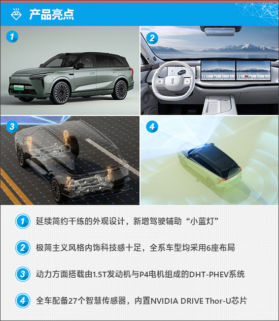 动力方面,新车搭载由1.5T发动机与P4电机组成的DHT-PHEV系统。其中,1.5T发动机最大功率125kW,最大扭矩245N·m;电动机总功率300kW,总扭矩580N·m,传动系统匹配4挡DHT混合动力专用变速箱。全系标配三元锂电池,根据配置不同,WLTC纯电续航里程分为185km和220km两个版本。