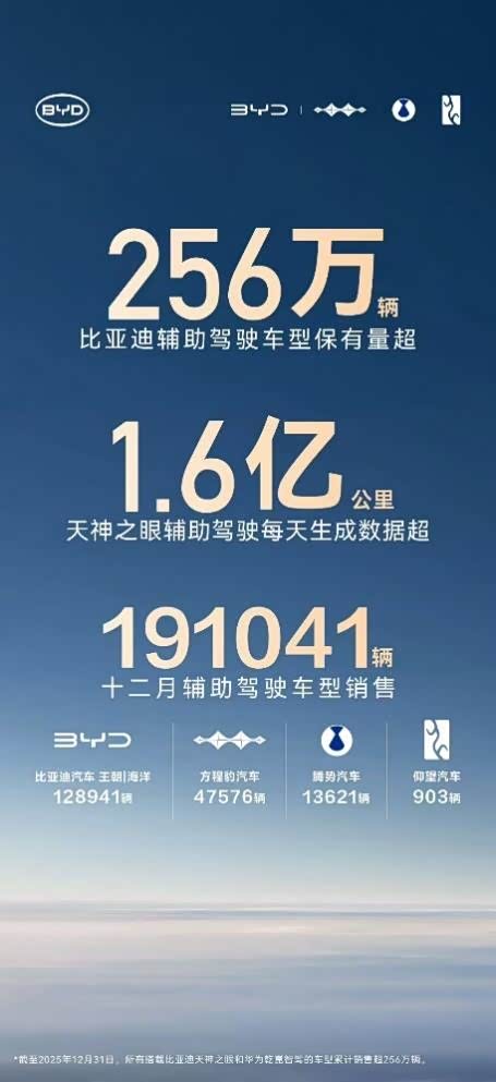当辅助驾驶从汽车行业的 “加分项” 变成用户购车的 “必选项”,比亚迪用实力给出了最优解。截至 2025 年 12 月,比亚迪辅助驾驶车型累计保有量超 256 万辆,稳居中国车企第一,让 “全民智驾” 的承诺照进现实,让技术普惠走入千家万户。