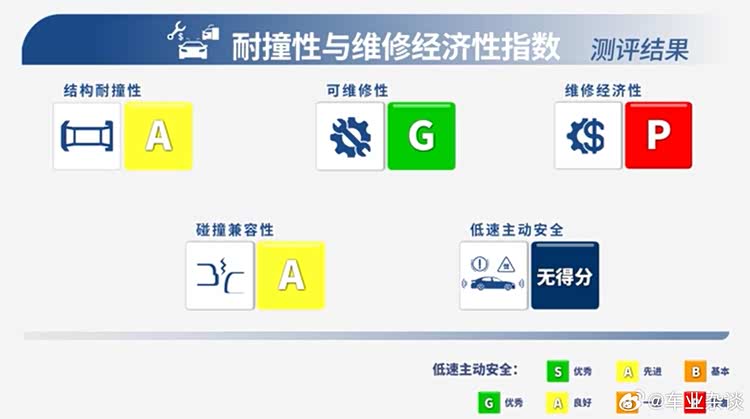 作为 4 款车型中唯一的豪华品牌燃油车,奥迪 A5L Sportback的测评结果格外引人注目 —— 它是本次测评中唯一在 “耐撞性与维修经济性” 维度获得 M(一般)评价的车型。
