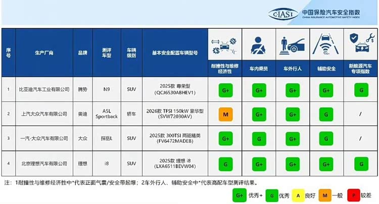 从整体测评表现来看,4 款车在车内乘员安全、车外行人安全、辅助安全等 5 大核心指标中几乎斩获全优评价,尤其是车外行人安全指标,4 款车均获得 G+(优秀 +)的顶级评价,车内乘员与辅助安全指标也全部达到 G(优秀)及以上水平,充分证明了当下主流车型在安全防护层面的高水准。其中,腾势 N9 以 4 项 G+、1 项 G 的成绩成为本次测评的佼佼者,理想 i8 与大众探岳 L 紧随其后,均拿下全优评价,而奥迪 A5L Sportback 则成为唯一的 “例外”。